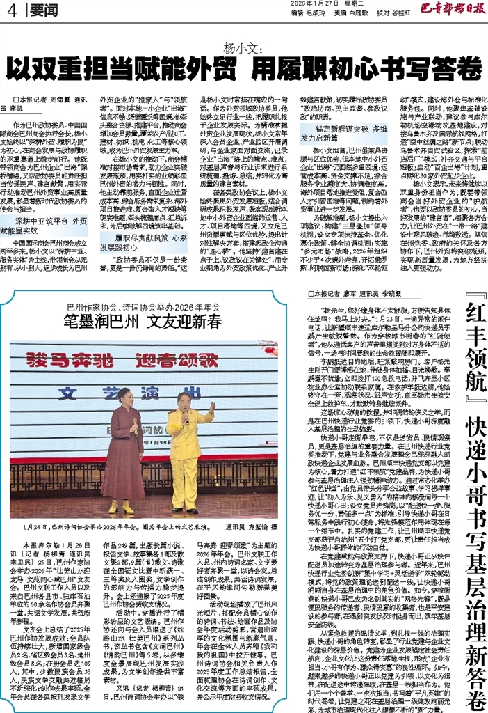 - 以双重担当赋能外贸 用履职初心书写答卷 □本报记者 周海霞 通讯员 蒋凯 作为巴州政协委员、中国国际商会巴州商会执行会长,杨小文始终以“深耕外贸、履职为民”为初心,在商会发展与政协履职的双重赛道上稳步前行。他既带领商会为巴州
