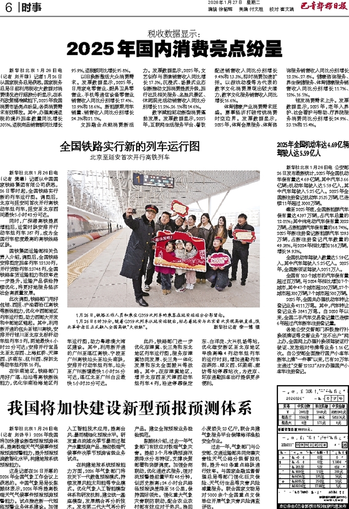 - 我国将加快建设新型预报预测体系 新华社北京1月26日电(记者 刘诗平) 2026年我国将加快建设新型预报预测体系,提高极端天气气候事件预报预测预警能力,提升预报预测数智化水平,构建地球系统预报能力。 这是记者在26日开幕的2