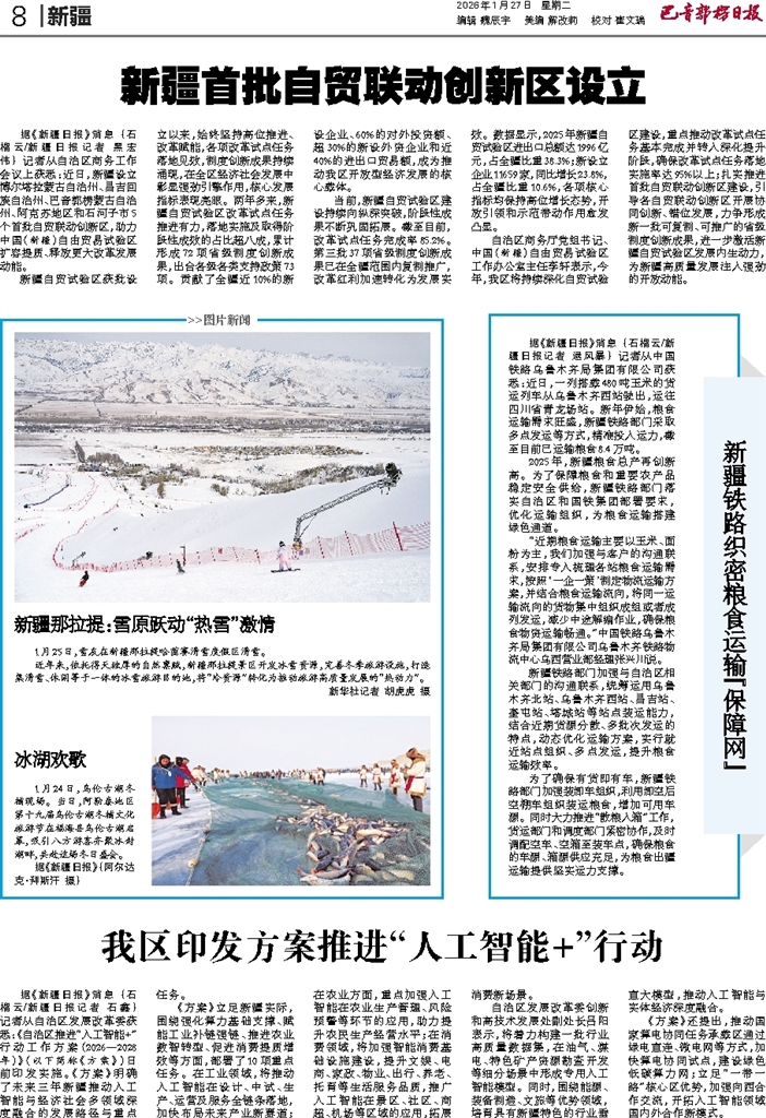 - 新疆铁路织密粮食运输“保障网” 据《新疆日报》消息 (石榴云/新疆日报记者 逯风暴) 记者从中国铁路乌鲁木齐局集团有限公司获悉:近日,一列搭载480吨玉米的货运列车从乌鲁木齐西站驶出,运往四川省青龙场站。新年伊始,粮食运输需求旺
