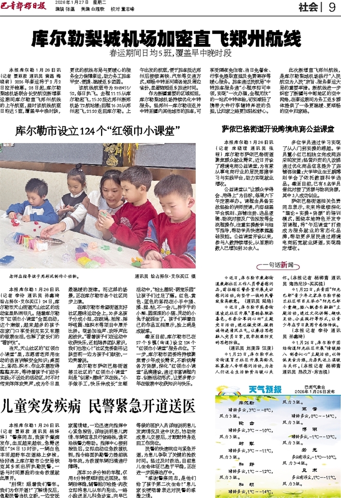 - 库尔勒梨城机场加密直飞郑州航线 本报库尔勒1月26日讯 (记者 景丽君 通讯员 黄晶 梅晓莉) 2026年春运将于2月2日拉开帷幕。28日起,库尔勒梨城机场联合长安航空新增春运期间库尔勒直飞郑州航线的上午航班,届时该航线航班日均