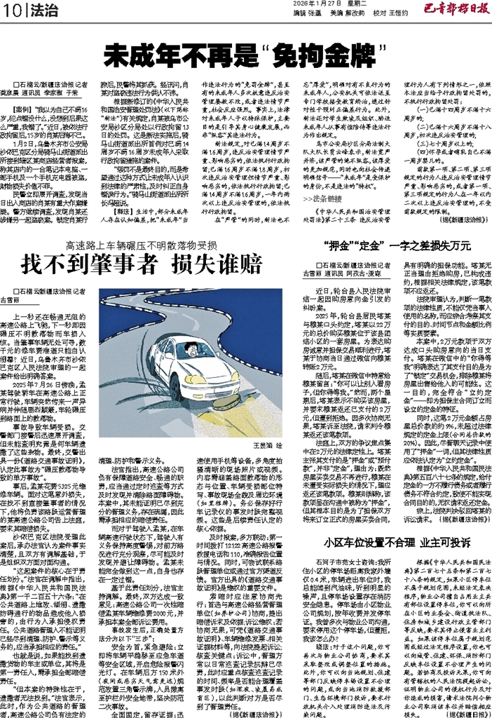 - 找不到肇事者 损失谁赔 □石榴云/新疆法治报记者 古雪丽 上一秒还在畅通无阻的高速公路上飞驰,下一秒却因碾压不明散落物而车损人惊。当肇事车辆无处可寻,数千元的修车费难道只能自认倒霉?近日,乌鲁木齐市沙依巴克区