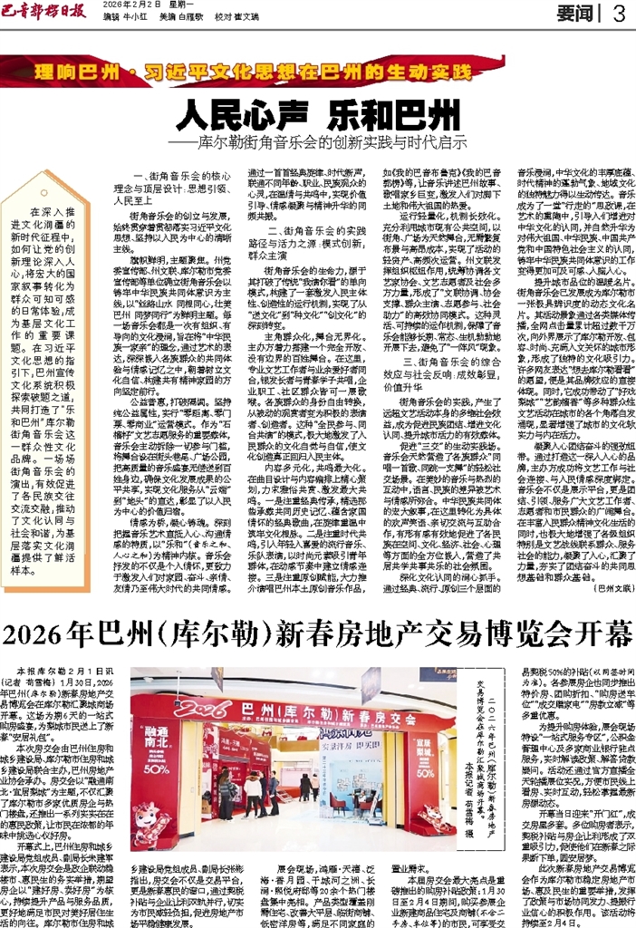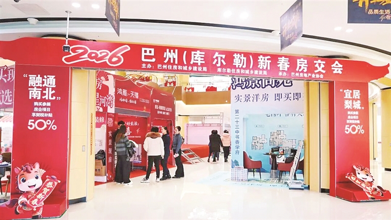 本报库尔勒2月1日讯 (记者 苟雪梅) 1月30日,2026年巴州(库尔勒)新春房地产交易博览会在库尔勒汇聚城商场开幕。这场为期6天的一站式购房盛宴,为梨城市民送上了新春“安居礼包”。