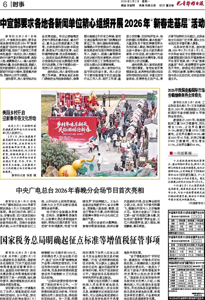 - 中宣部要求各地各新闻单位精心组织开展2026年“新春走基层”活动 新华社北京2月1日电 近日,中宣部发出通知,要求各地各新闻单位把2026年“新春走基层”活动作为全年主题宣传重要开篇,组织广大新闻工作者奔赴基层一线采访,深入挖掘反映时代新气象的鲜活故事、典型人