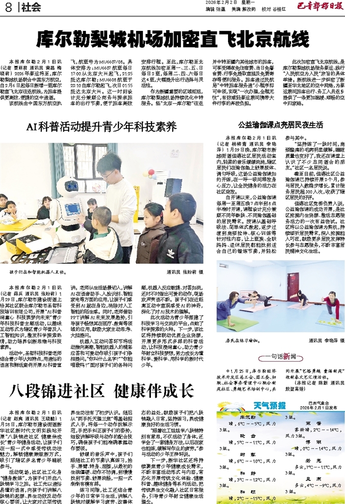 - 八段锦进社区 健康伴成长 本报库尔勒2月1日讯 (记者 赵爽 通讯员 王晓懿) 1月28日,库尔勒市建设街道新华社区新时代文明实践站开展“八段锦进社区 健康伴成长”青少年健身活动,让孩子们在一招一式中感受传统功法魅力,解锁