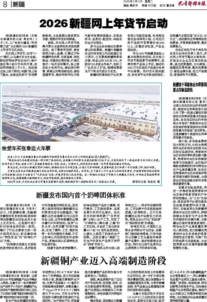 据《新疆日报》消息 (石榴云/新疆日报记者 黑宏伟) 2月1日,以“电商兴疆品·年货惠万家”为主题的2026新疆网上年货节正式启动。