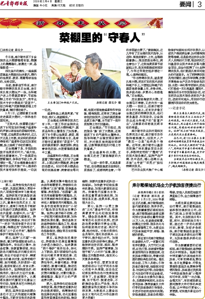本报库尔勒2月3日讯(记者 景丽君 通讯员 龙凤丽) 2月2日,2026年春运正式启幕,库尔勒梨城机场内暖意涌动、秩序井然。作为新疆重要区域枢纽机场,库尔勒梨城机场春运期间预计旅客吞吐量将突破33万人次,机场提前部署,统筹运力安排、服务优化与安全管理等工作,为春运出行旅客架起平安、顺畅、温暖的桥梁。