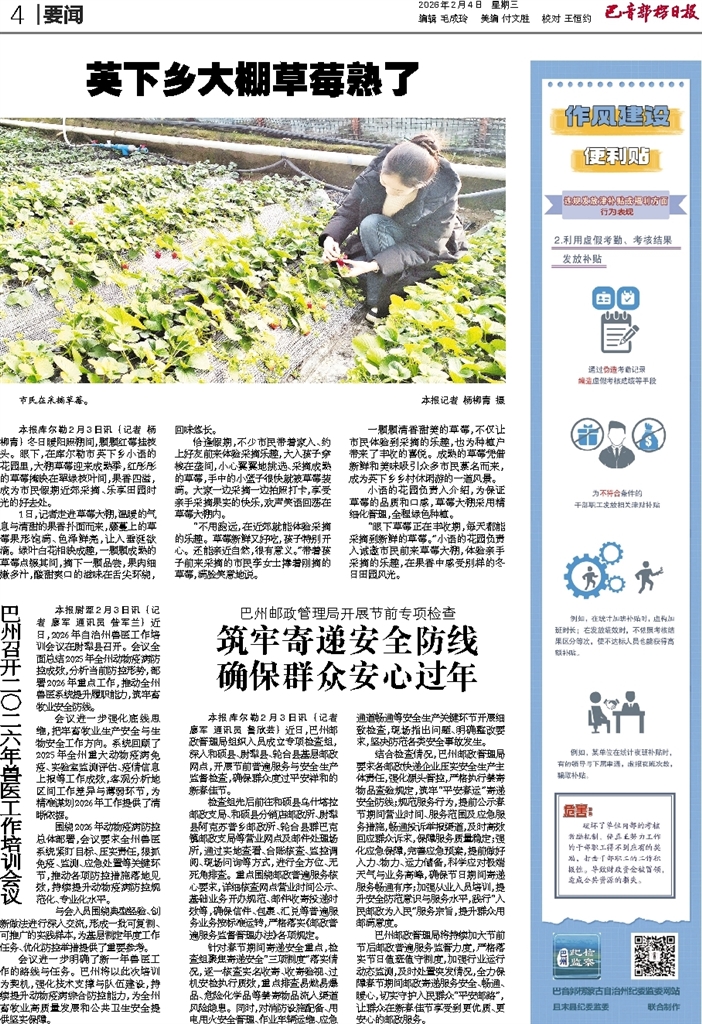 - 筑牢寄递安全防线 确保群众安心过年 本报库尔勒2月3日讯 (记者 廖军 通讯员 鲁欣芸) 近日,巴州邮政管理局组织人员成立专项检查组,深入和硕县、尉犁县、轮台县基层邮政网点,开展节前普遍服务与安全生产监督检查,确保群众度过平安祥和的