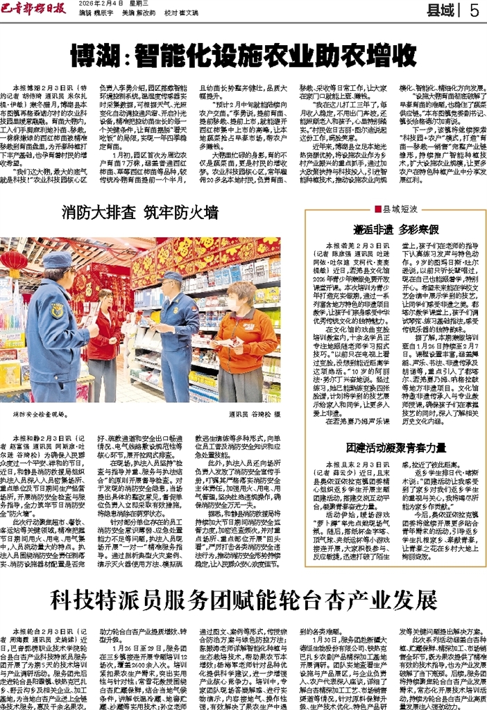 - 科技特派员服务团赋能轮台杏产业发展 本报轮台2月3日讯 (记者 周海霞 通讯员 史婉娣) 近日,巴音郭楞职业技术学院轮台县白杏产业科技特派员服务团开展了为期5天的技术培训与产业调研活动。服务团先后走进轮台县阳霞镇、铁热克巴扎乡、野云