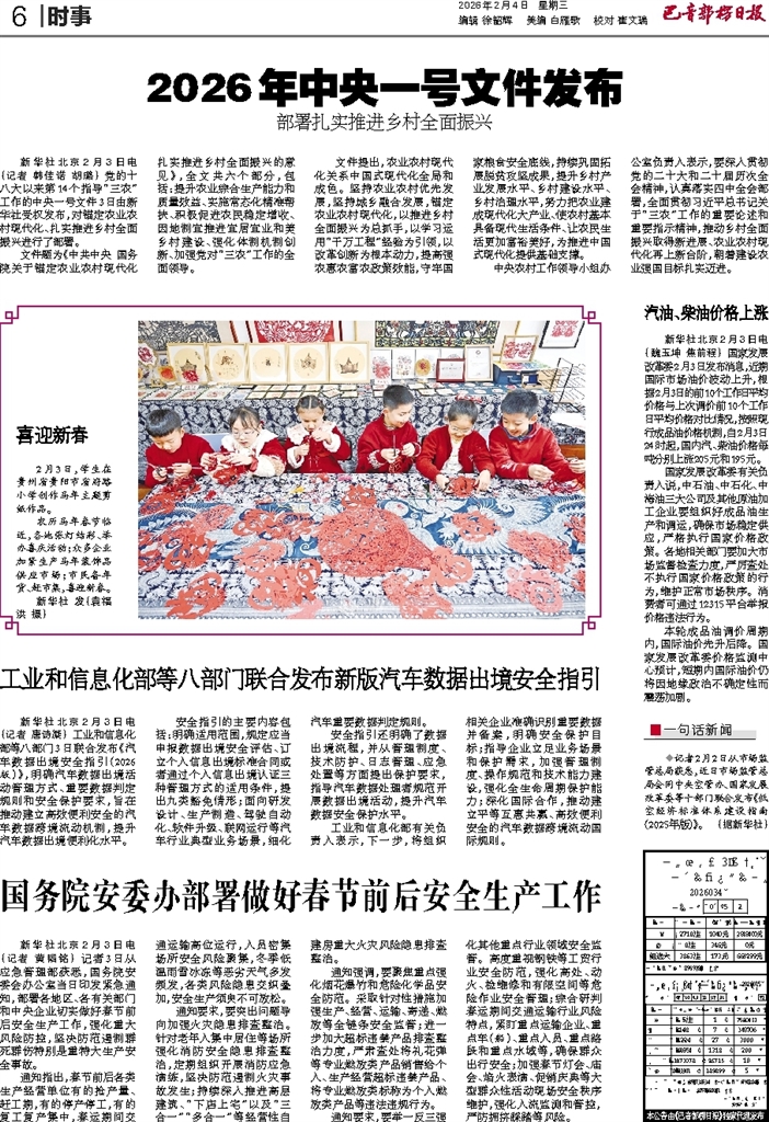- 2026年中央一号文件发布 新华社北京2月3日电 (记者 韩佳诺 胡璐) 党的十八大以来第14个指导“三农”工作的中央一号文件3日由新华社受权发布,对锚定农业农村现代化、扎实推进乡村全面振兴进行了部署。 文件题为《中共中
