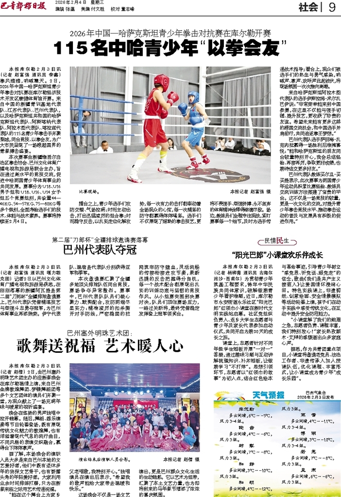 - 115名中哈青少年“以拳会友” 本报库尔勒2月3日讯 (记者 赵富强 通讯员 李鑫) 拳风猎猎,呐喊震天。2日,2026年中国—哈萨克斯坦青少年拳击对抗赛在库尔勒经济技术开发区康健体育馆开赛。来自中国的新疆青训基地代表队、江苏代