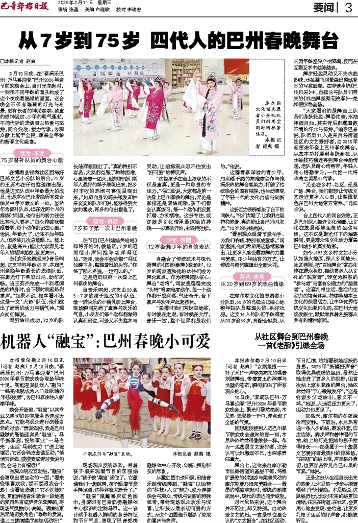 - 从7岁到75岁 四代人的巴州春晚舞台 □本报记者 赵爽 2月10日晚,在“春满乐巴州·万马喜迎春”巴州2026年春节联欢晚会上,当灯光亮起时,一张张不同年龄的面孔构成了这个夜晚最温暖的画面。这台晚会不仅有璀璨的灯光与布景,