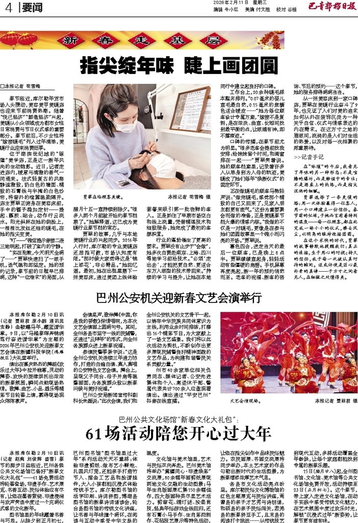 - 指尖绽年味 睫上画团圆 □本报记者 苟雪梅 春节临近,库尔勒年货市场人头攒动,美容美甲美睫店也迎来节前消费热潮。随着“悦己经济”“颜值经济”兴起,美睫从小众领域成为都市女性日常消费与节日仪式感的重要部分。春节