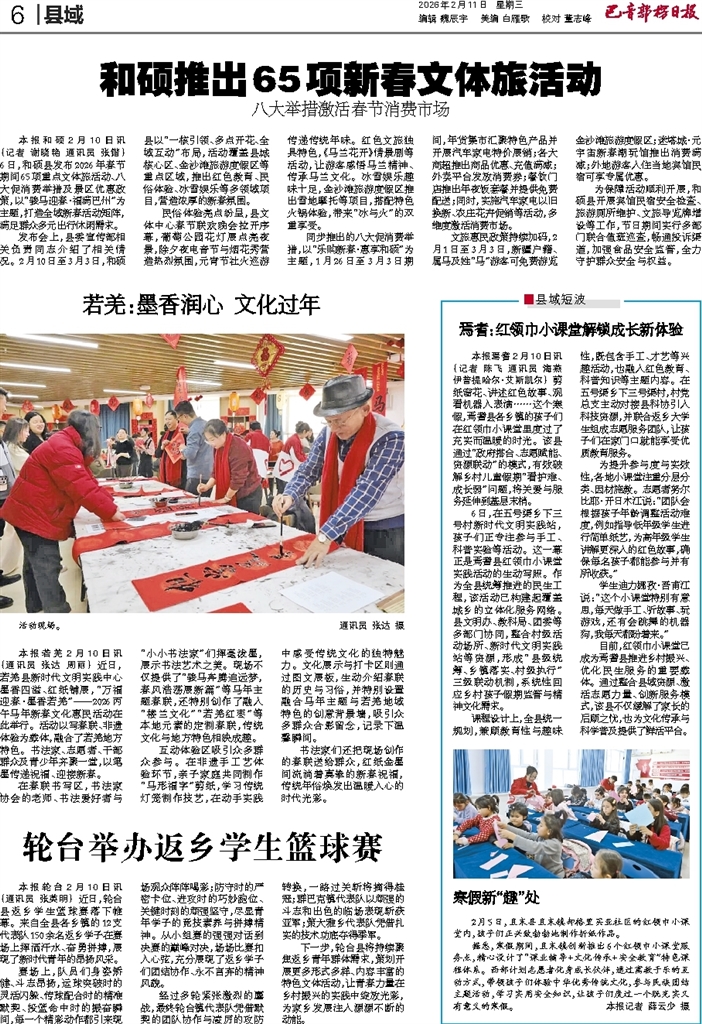 - 和硕推出65项新春文体旅活动 本报和硕2月10日讯 (记者 谢晓艳 通讯员 张锴) 6日,和硕县发布2026年春节期间65项重点文体旅活动、八大促消费举措及景区优惠政策,以“骏马迎春·福满巴州”为主题,打造全域新春活动矩阵,满