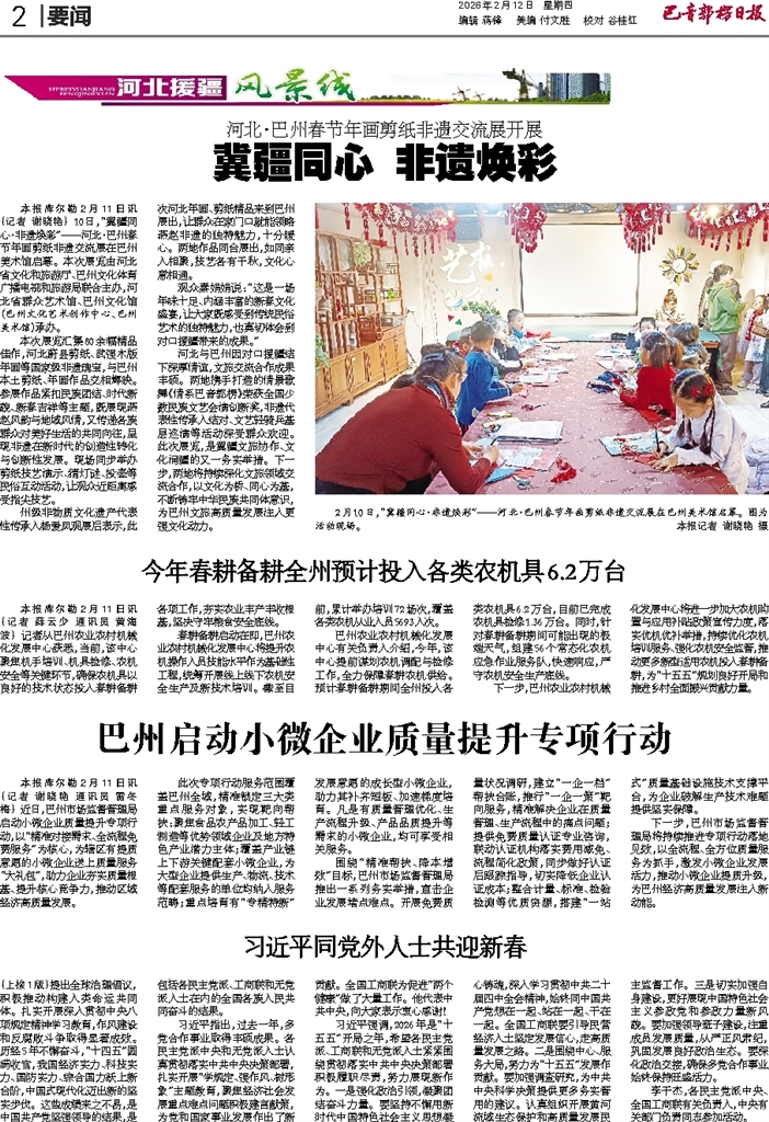 本次展览汇集80余幅精品佳作,河北蔚县剪纸、武强木版年画等国家级非遗瑰宝,与巴州本土剪纸、年画作品交相辉映。参展作品紧扣民族团结、时代新貌、新春吉祥等主题,既展现燕赵风韵与地域风情,又传递各族群众对美好生活的共同向往,呈现非遗在新时代的创造性转化与创新性发展。现场同步举办剪纸技艺演示、猜灯谜、投壶等民俗互动活动,让观众近距离感受指尖技艺。