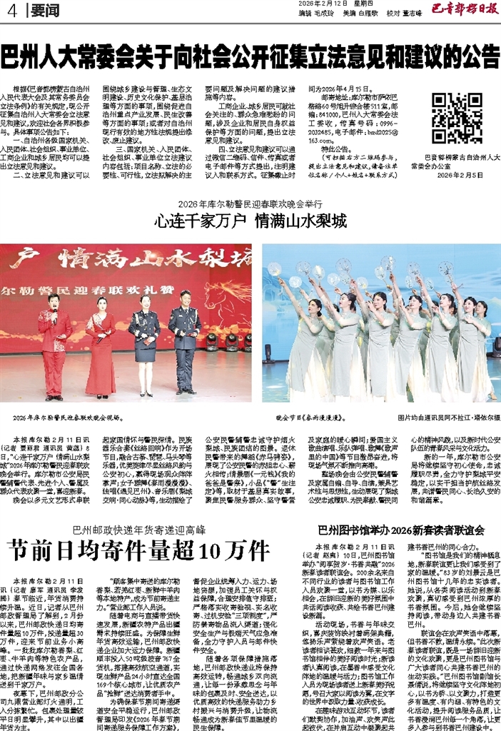 - 心连千家万户 情满山水梨城 本报库尔勒2月11日讯 (记者 景丽君 通讯员 黄蕊) 8日,“心连千家万户 情满山水梨城”2026年库尔勒警民迎春联欢晚会举行。库尔勒市公安局民警辅警代表、先进个人、警属及群众代表欢聚一堂,喜迎