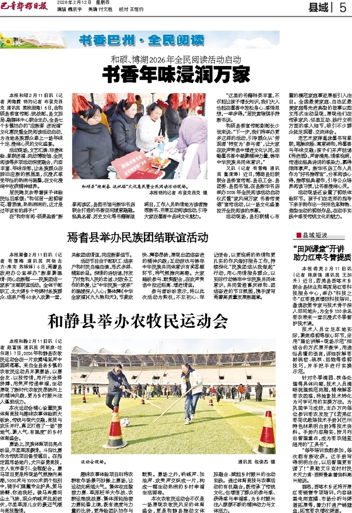 - 和静县举办农牧民运动会 本报和静2月11日讯 (记者 赵富强 通讯员 阿斯彦·吐尔逊) 7日,2026年和静县农牧民运动会在一片欢腾喝彩声中圆满落幕。来自全县各乡镇的农牧民运动员齐聚赛场,以赛会友、以技传情,用汗水诠释拼