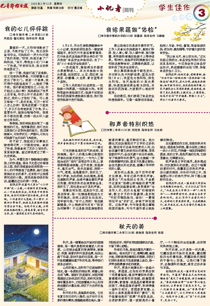 - 我给果蔬做“体检” □库尔勒市第四小学四(9)班 阎嘉琪 指导老师 马静敏 2月8日,作为巴音郭楞融媒体中心小记者,我来到领悦里负一楼家满福超市,参加巴州市场监督管理局、巴州食品药品检验所联合举办的“你点我检”食