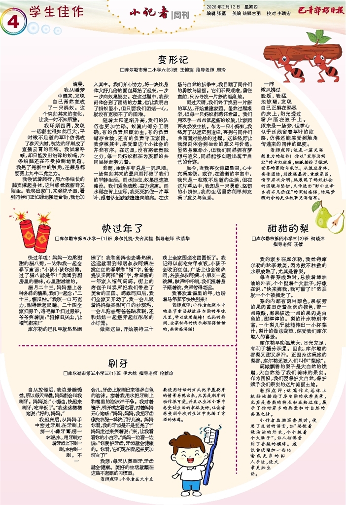 - 快过年了 □库尔勒市第五小学一(1)班 米尔扎提·艾合买提 指导老师 代清华 快过年啦!妈妈一边熬甜甜的腊八粥,一边和我一起念春节童谣:“小孩小孩你别馋,过了腊八就是年!”我闻到厨房里的香味,心里甜滋滋