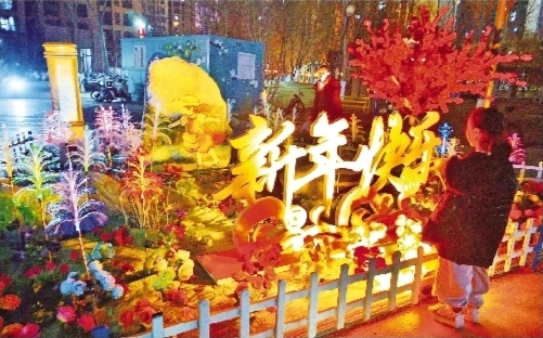2月14日,小朋友在库尔勒市领地·凯旋公馆小区内观看景观小品。