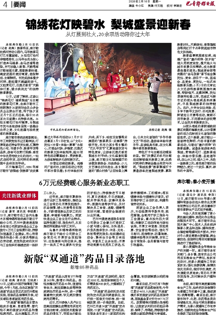 冰雪运动燃动新春。鸿雁河广场的冰上娱乐活动让市民尽享冰雪乐趣;乡村体验别有风味,英下乡、哈拉玉宫镇等采摘园的“新春果乐·采摘季”持续开放,托布力其乡等乡镇的“巴扎年货节”汇聚地道农货与特色美食,让游客沉浸式感受梨城乡村年味;文化盛宴轮番上演,库尔勒文化馆演播厅的诗歌贺春晚会、戏曲晚会、少儿文艺演出好戏连台,各乡镇街道的“群众村晚”让百姓登上舞台,公共文化场馆的“手作书香文艺”年活动,邀游客体验非遗手作、品读经典书香,在文化熏陶中感受新春雅韵。
