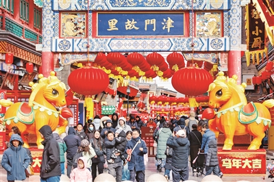 春节将至,天津古文化街热闹非凡。人们在这里品味年味,感受传统民俗文化魅力,喜迎马年春节。