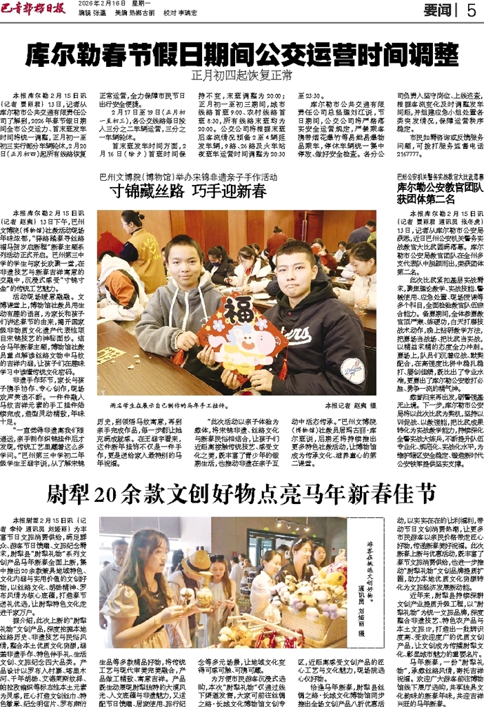 - 寸锦藏丝路 巧手迎新春 本报库尔勒2月15日讯 (记者 赵爽) 13日下午,巴州文博院(博物馆)社教活动现场年味浓郁,“驿路踏春寻丝路 福马贺岁启新程”新春主题系列活动正式开启。巴州第三中学的学生与家长欢聚一堂,在非遗技