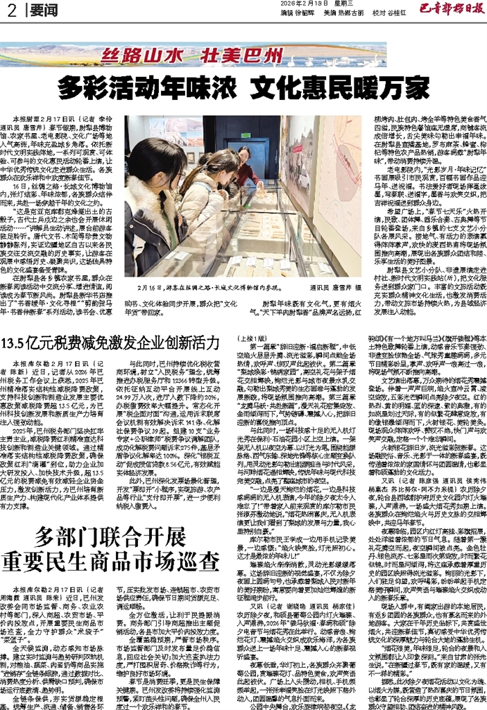 - 13.5亿元税费减免激发企业创新活力 本报库尔勒2月17日讯 (记者 陈新) 近日,记者从2026年巴州税务工作会议上获悉,2025年巴州精准落实结构性减税降费政策,支持科技创新和制造业发展主要优惠政策减税降费超13.5亿元,为巴州科