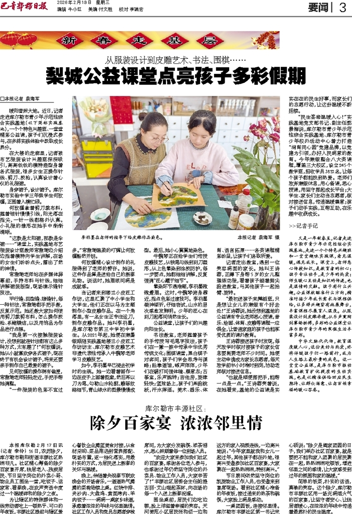 本报库尔勒2月17日讯 (记者 李伶) 16日,农历除夕,库尔勒市朝阳街道丰源社区热闹非凡。社区精心筹备的除夕百家宴开席,独居老人、残疾居民、节日坚守岗位的外卖小哥、物业员工围坐一堂,吃饺子、话家
