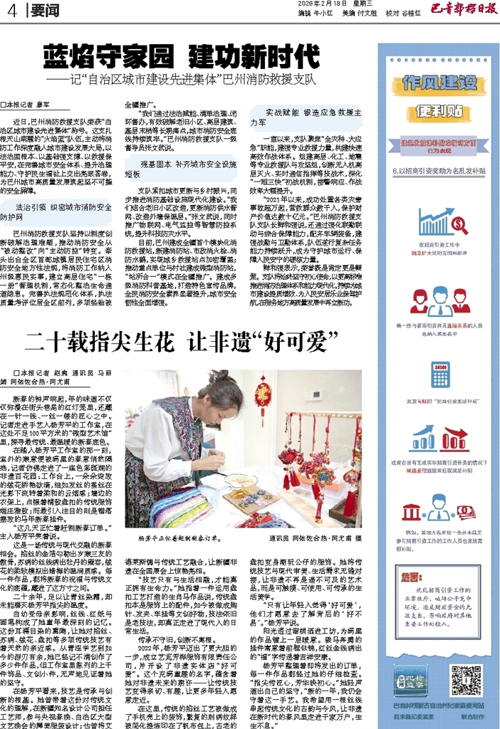 □本报记者 廖军 近日,巴州消防救援支队荣获“自治区城市建设先进集体”称号。这支扎根天山南麓的“火焰蓝”队伍,主动将消防工作深度融入城市建设发展大局,以法治固根本、以基础强支撑、以救援