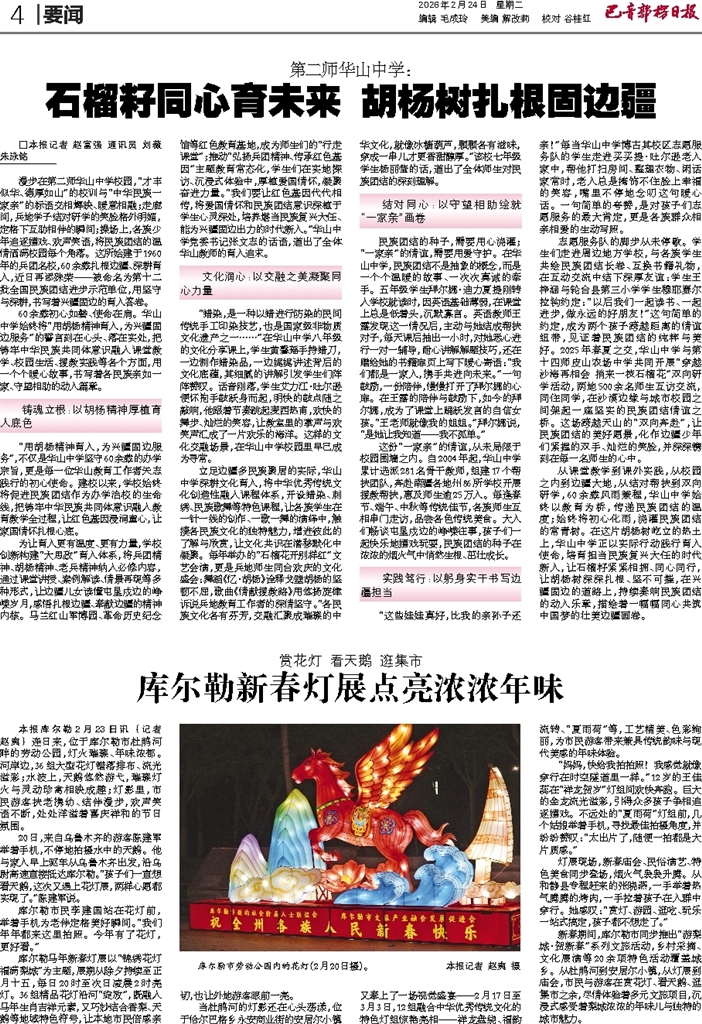 □本报记者 赵富强 通讯员 刘薇 朱泳铭 漫步在第二师华山中学校园,“才丰似华、德厚如山”的校训与“中华民族一家亲”的标语交相辉映、暖意相融;走廊间,兵地学子结对研学的笑脸格外明媚,定