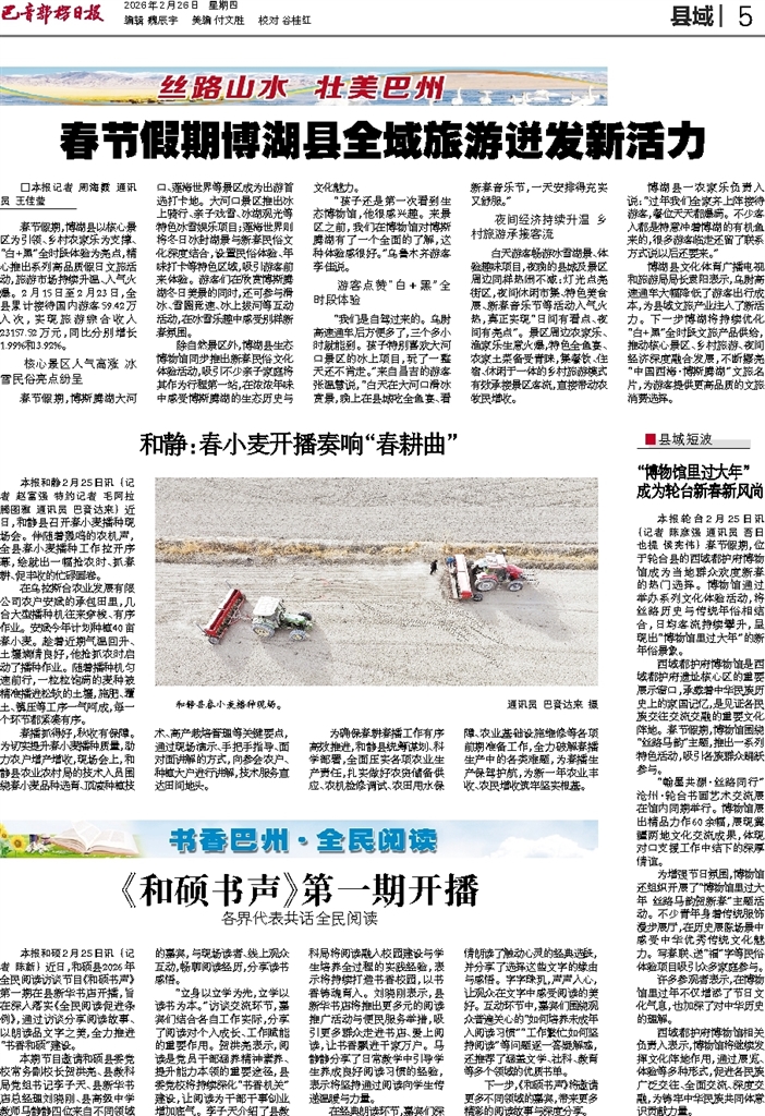 本报和静2月25日讯 (记者 赵富强 特约记者 毛阿拉腾图雅 通讯员 巴音达来) 近日,和静县召开春小麦播种现场会。伴随着轰鸣的农机声,全县春小麦播种工作拉开序幕,绘就出一幅抢农时、抓春耕、促丰收的忙碌画卷。