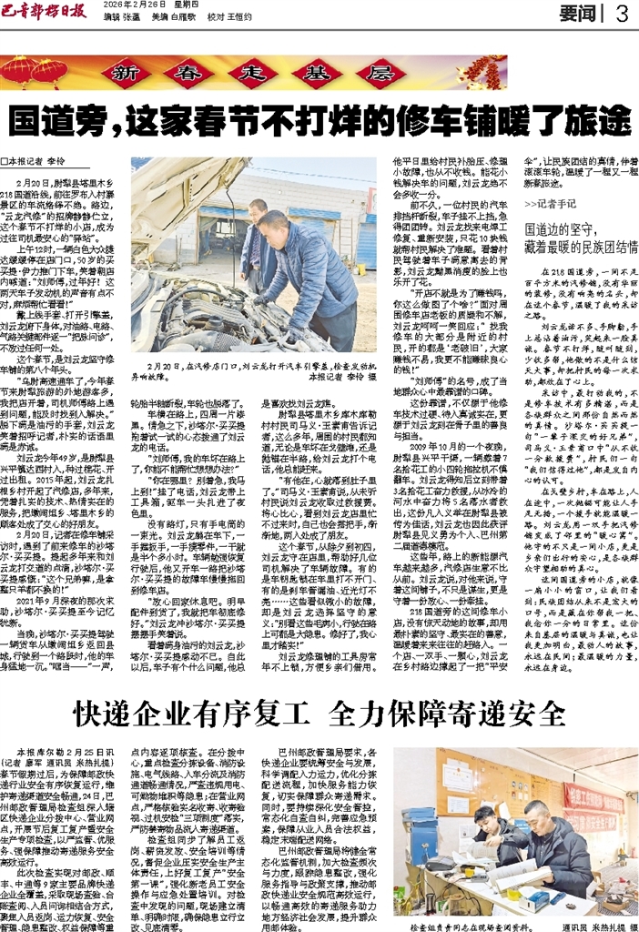 □本报记者 李伶 2月20日,尉犁县塔里木乡218国道沿线,前往罗布人村寨景区的车流络绎不绝。路边,“云龙汽修”的招牌静静伫立,这个春节不打烊的小店,成为过往司机最安心的“驿站”。
