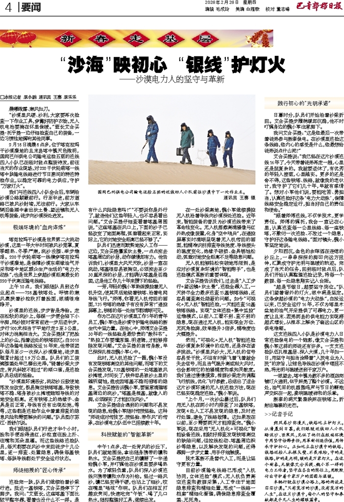 □本报记者 原小鹏 通讯员 王骞 原乐乐 晨曦微露、寒风如刀。 “沙漠里风硬、沙利,大家要再次检查一下作业工具,穿戴好防护衣物,无人机电池要揣在怀里保暖。”班长艾合买提·托乎提一边仔细检