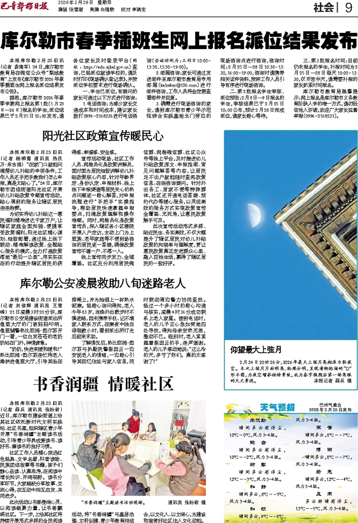 - 仰望最大上弦月 2月24日20时28分,2026年最大上弦月亮相库尔勒夜空。本次上弦月月面明亮、轮廓分明,呈现清晰饱满的“D”形半圆,为夜空增添独特景致,成为春节假期后第一场亮眼的天文景观。本报记者 薛兵 摄