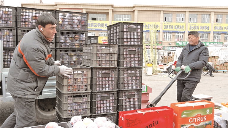 2月27日,新疆九鼎梨城农产品市场(以下简称九鼎市场)内一派繁忙景象。一辆辆满载着果蔬、肉类的大小货车在市场内穿行。商户们麻利地将一箱箱香梨、苹果从车上卸下,码放整齐。前来批发货物的商贩推着小车,在各个摊位前精挑细选。
