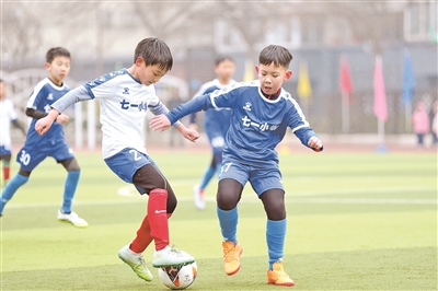 3月2日,北京市海淀区七一小学学生在“浪花杯”班级足球联赛中拼抢。