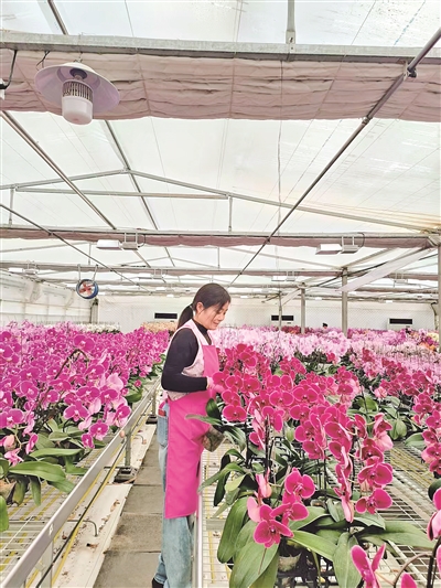 2月26日,记者走进该花卉基地,恒温恒湿的智能大棚内暖意融融,不同品种的蝴蝶兰亭亭玉立、竞相吐蕊,满目皆是盎然春意。身着工装的花农们穿梭其间,浇水、施肥、整形、定枝……指尖轻触间,精心呵护着每一株娇贵的兰花。