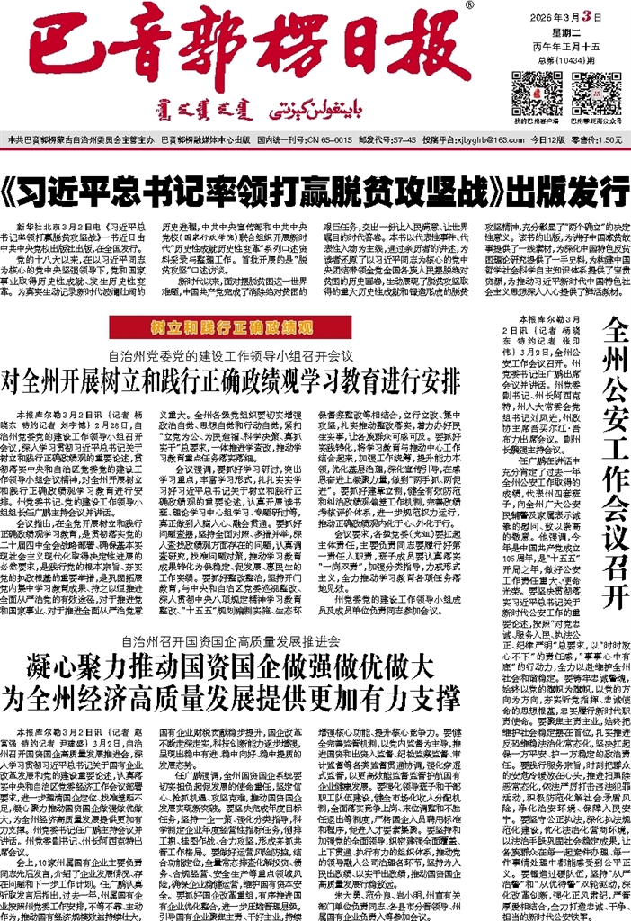 - 凝心聚力推动国资国企做强做优做大 为全州经济高质量发展提供更加有力支撑 本报库尔勒3月2日讯 (记者 赵富强 特约记者 尹建盛) 3月2日,自治州召开国资国企高质量发展推进会,深入学习贯彻习近平总书记关于国有企业改革发展和党的建设重要论述,认真落实中央和自治区党委经济