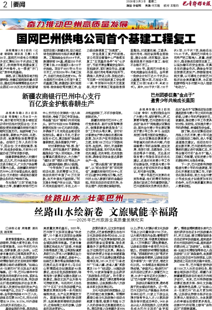 - 丝路山水绘新卷 文旅赋能幸福路 □本报记者 周海霞 通讯员 杨军辉 春赏梨雪漫枝头,夏逐碧波游湖畔,秋踏大漠寻古韵,冬戏冰雪享温情。2025年的巴州大地,四季皆景,游人如织。从巴音布鲁克的辽阔草原到罗布人村寨的大漠风