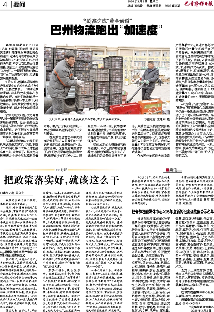- 把政策落实好,就该这么干 □本报记者 苗向光 政策的生命力在于执行,惠民的真谛在于落地。 近日,看到博湖县通过“宣传全覆盖、审核严标准”的务实之举,认真落实自治区“牧九条”,高效精准完成2025—2026年