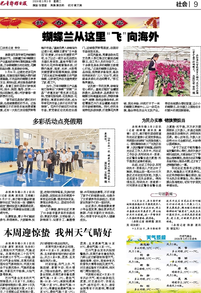 - 本周迎惊蛰 我州天气晴好 本报库尔勒3月2日讯 (记者 廖军 通讯员 仇会民)上周我州天气晴好,气温适宜。本周将迎来二十四节气中的第三个节气——惊蛰,据巴州气象台预报,本周无明显强冷空气影响我州,平原大部由于长期无降水、气