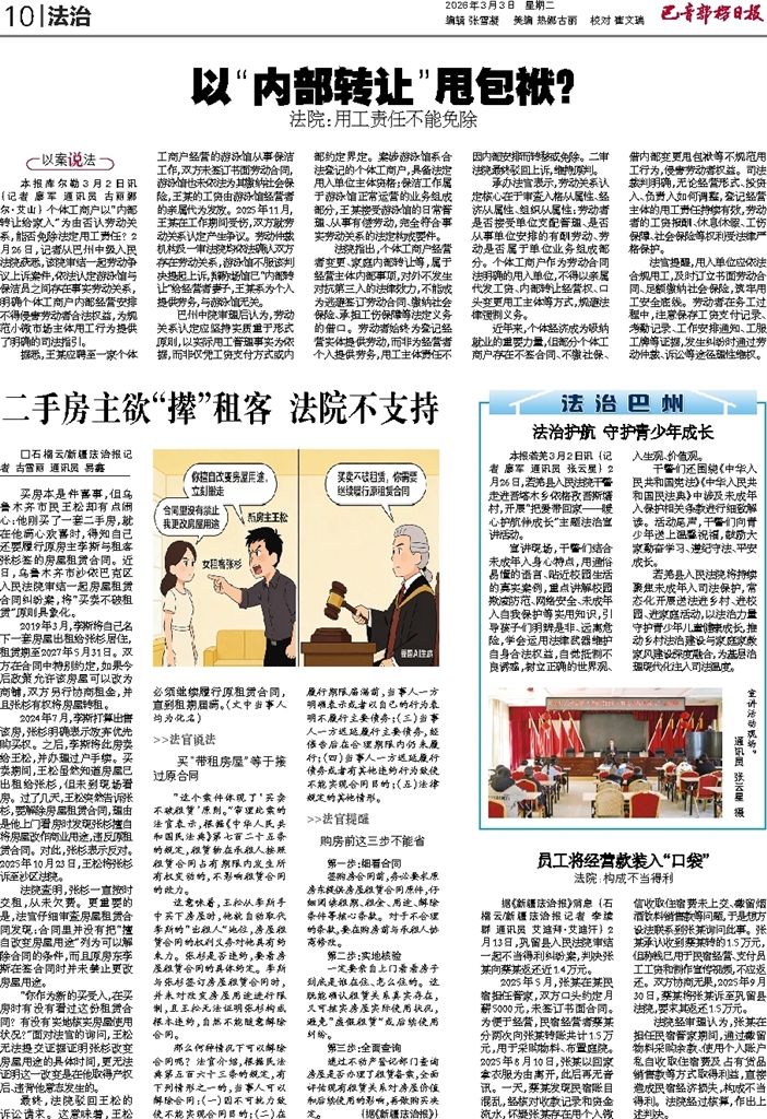 - 以“内部转让”甩包袱? 本报库尔勒3月2日讯 (记者 廖军 通讯员 古丽娜尔·艾山) 个体工商户以“内部转让给家人”为由否认劳动关系,能否免除法定用工责任?2月26日,记者从巴州中级人民法院获悉,该院审结一起劳动争议上诉