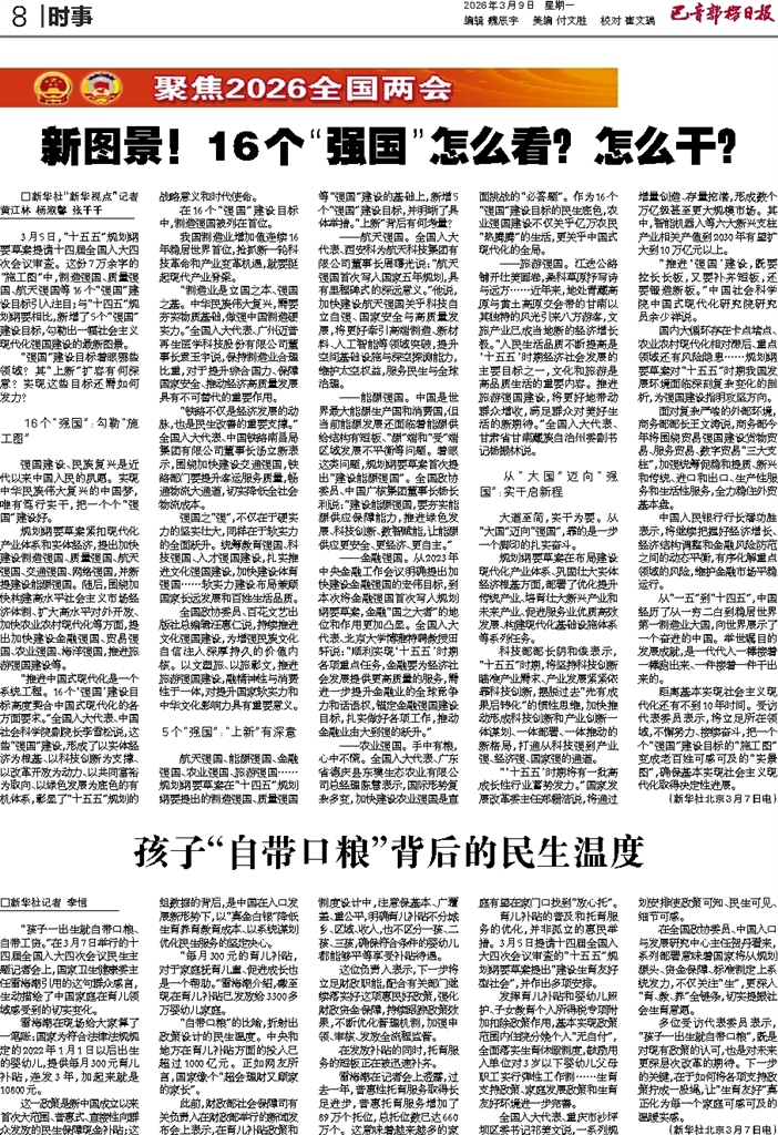 □新华社“新华视点”记者黄江林 杨淑馨 张千千 3月5日,“十五五”规划纲要草案提请十四届全国人大四次会议审查。这份7万余字的“施工图”中,制造强国、质量强国、航天强国等16个“强国”