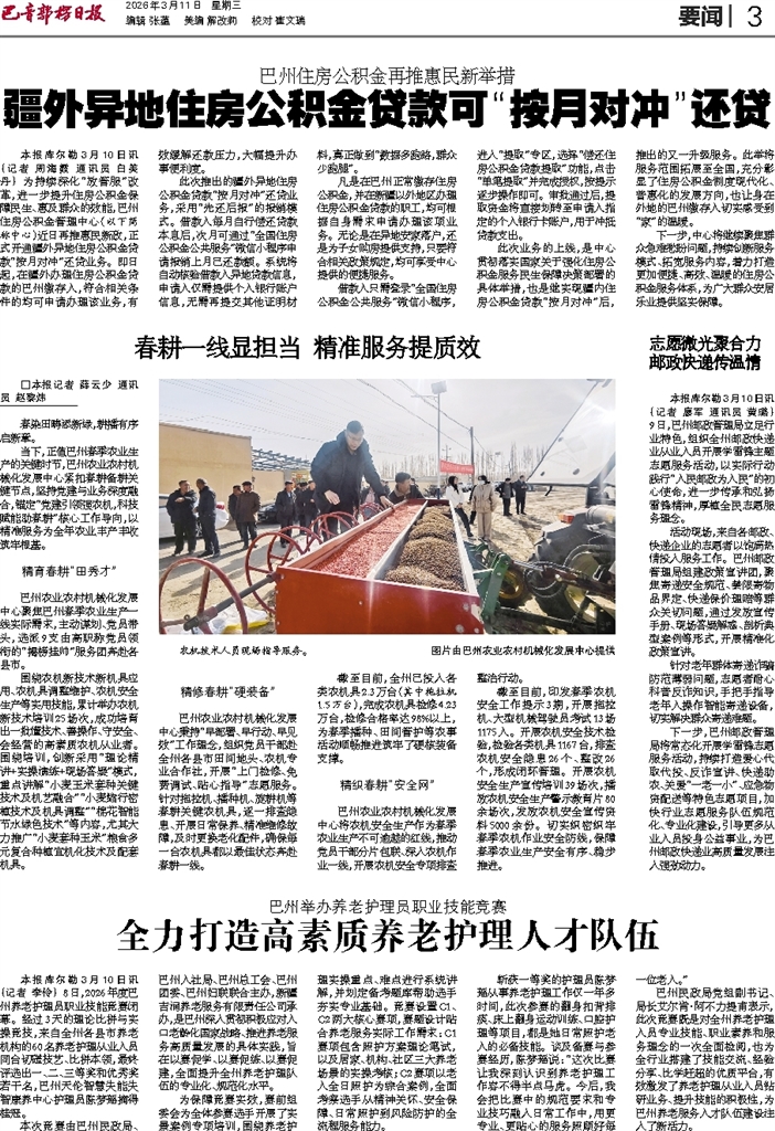 - 春耕一线显担当 精准服务提质效 □本报记者 薛云少 通讯员 赵黎炜 春染田畴添新绿,耕播有序启新章。 当下,正值巴州春季农业生产的关键时节,巴州农业农村机械化发展中心紧扣春耕备耕关键节点,坚持党建与业务深度融合,