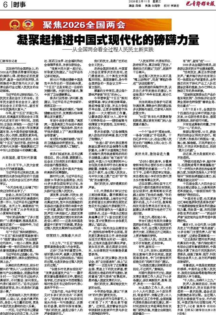 □新华社记者 正在进行的全国两会上,约5000名代表委员带着田间地头的调研心得、街巷社区的民意民声、基层一线的所思所想,共商推进中国式现代化大计,铺展出践行全过程人民民主的生动画卷。