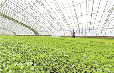 惊蛰过后,库车市乌恰镇乌恰三村温室大棚培育的辣椒、小葱、西红柿等2000余万株蔬菜苗长势喜人,预计3月底开始销售。图为农户正在浇灌蔬菜幼苗。