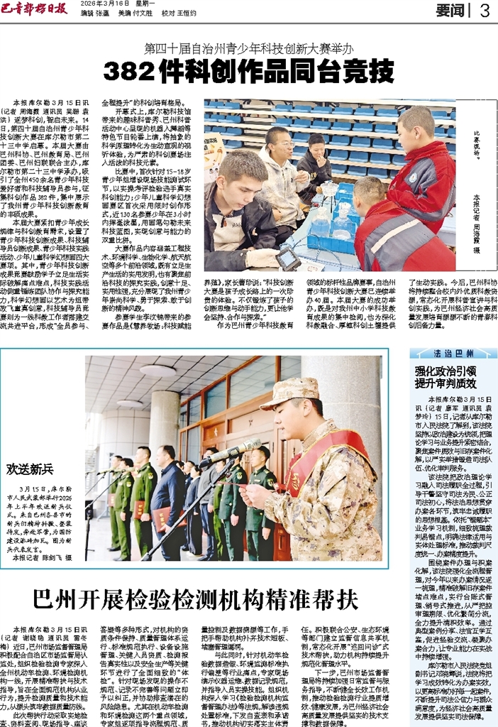 - 欢送新兵 3月15日,库尔勒市人民武装部举行2026年上半年欢送新兵仪式。来自巴州各县市的新兵们精神抖擞、整装待发,奔赴军营,为国防建设添砖加瓦。图为新兵代表发言。 本报记者 陈剑飞 摄