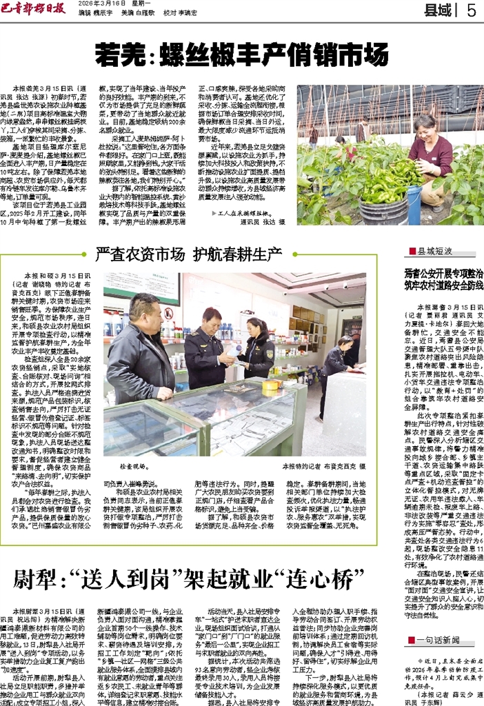 - 严查农资市场 护航春耕生产 本报和硕3月15日讯 (记者 谢晓艳 特约记者 布音克西克) 眼下正值春耕备耕关键时期,农资市场迎来销售旺季。为保障农业生产安全,规范市场秩序,连日来,和硕县农业农村局组织开展专项检查行动,以精准