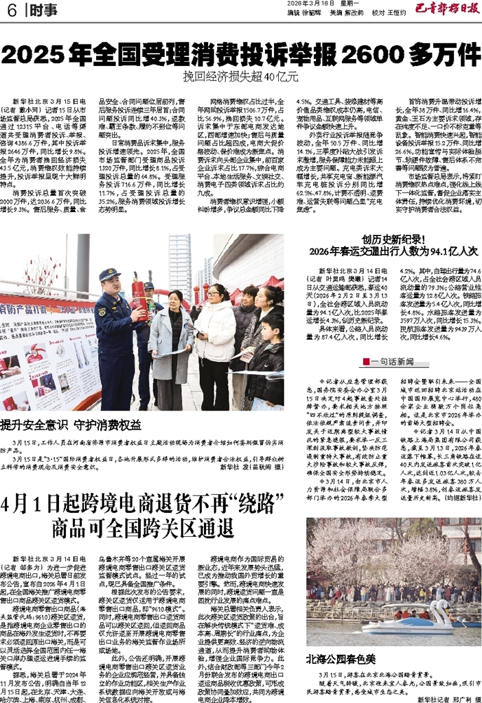 - 2025年全国受理消费投诉举报2600多万件 新华社北京3月15日电 (记者 戴小河) 记者15日从市场监管总局获悉,2025年全国通过12315平台、电话等渠道共受理消费者投诉、举报、咨询4386.6万件,其中投诉举报2646万件,同比增长