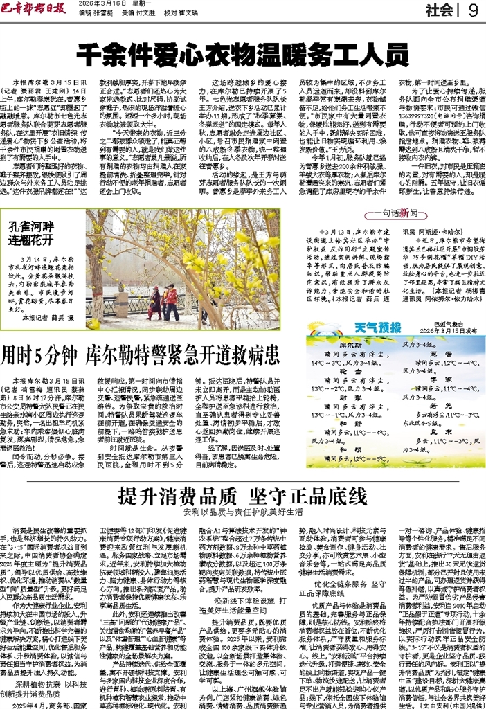 - 千余件爱心衣物温暖务工人员 本报库尔勒3月15日讯 (记者 景丽君 王建刚) 14日上午,库尔勒春寒犹在,普惠乡街上的一抹“志愿红”却攒起了融融暖意。库尔勒市七色光志愿者服务队联合萌芽志愿者服务队,在这里开展“衣旧情深 传递